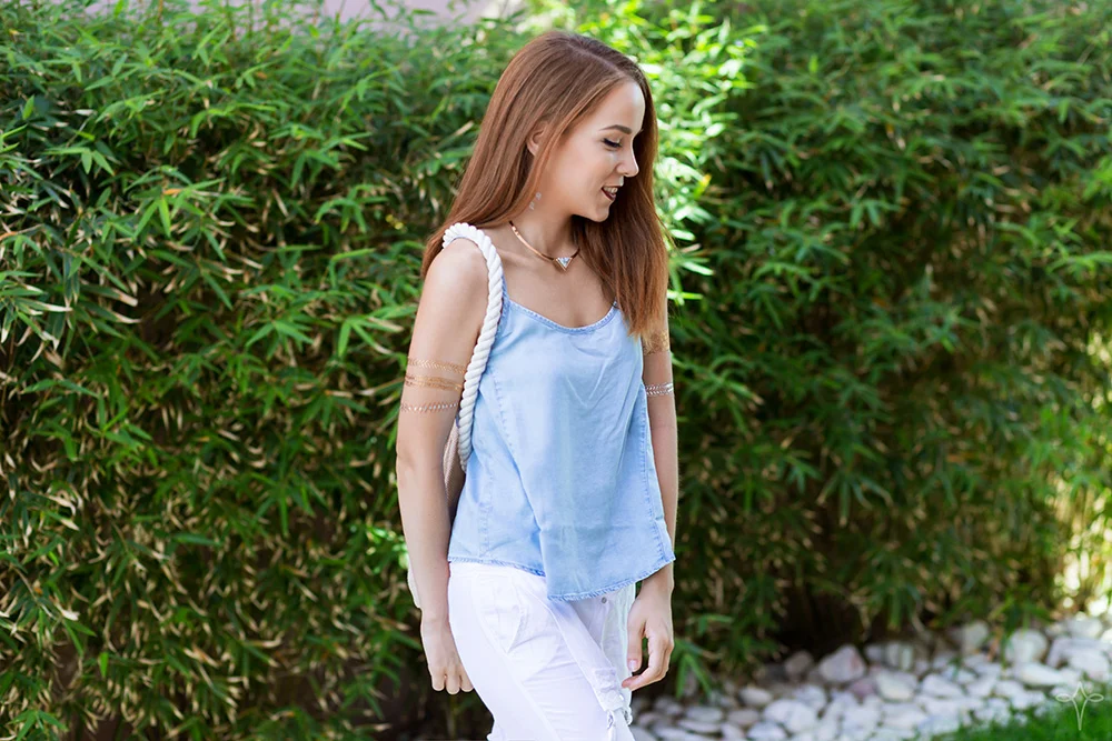Denim Top: Stradivarius (similar) • Linen Dungarees: Stradivarius • Fur Slip-ons: Uterque • Stone Triangle Choker: Mango • Raffia Rucksack: Zara • Metallic Tattoos: Stradivarius (similar)